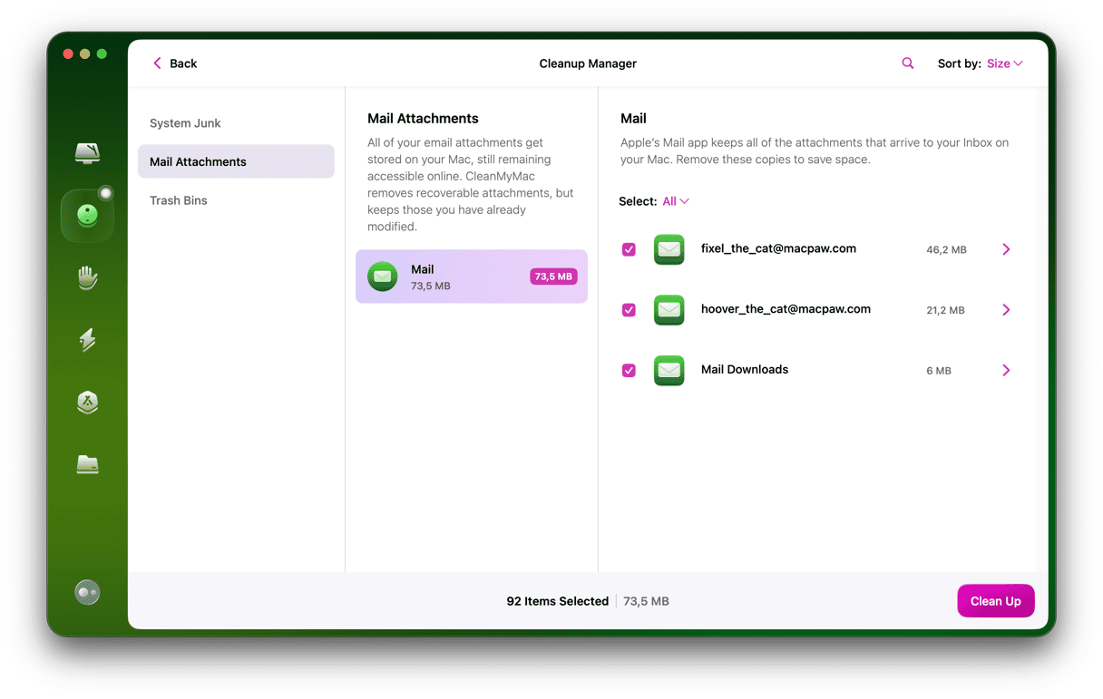 您可以安全地从 Mac 中删除这些附件,而不会失去对它们的访问权限。它们仍然存储在电子邮件服务器上,并且可以在需要时重新下载。即使使用过滤器,寻找附件以释放空间也可能很乏味。幸运的是,有一个更简单的方法。 CleanMyMac 的清理功能会扫描您的 Mac 并找到所有附件,让您删除它们以回收空间。以下是如何使用它。