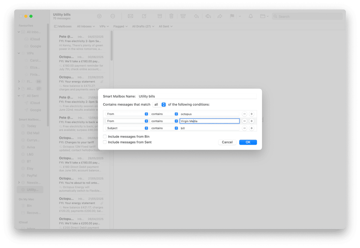 要在“邮件”中创建新的智能邮箱,请单击“邮箱”菜单并选择“新建智能邮箱”。为智能邮箱命名,然后选择用于选择要显示的消息的第一个标准。如果您想添加更多条件,请单击“+”。完成后,单击“确定”。