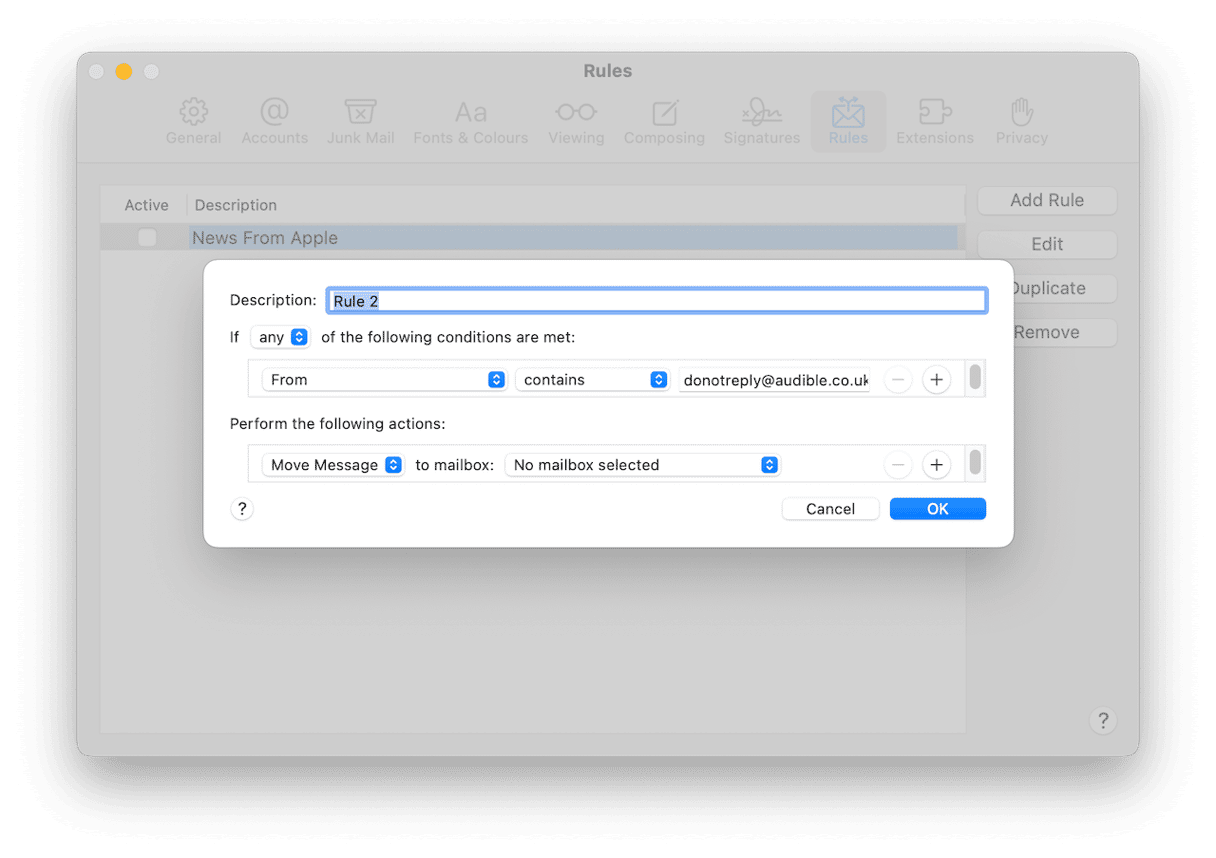 大多数电子邮件应用程序(包括“邮件”)允许您为传入邮件创建规则,以决定如何处理邮件。例如,您可以创建一条规则,将某个收件人或一组收件人的所有邮件移至特定文件夹。或者自动删除主题行中包含指定单词的邮件。