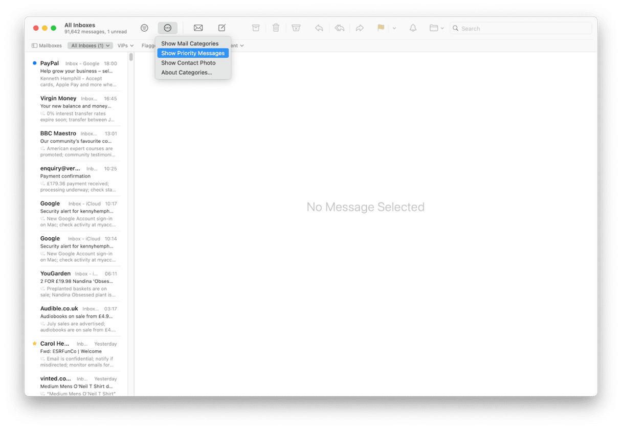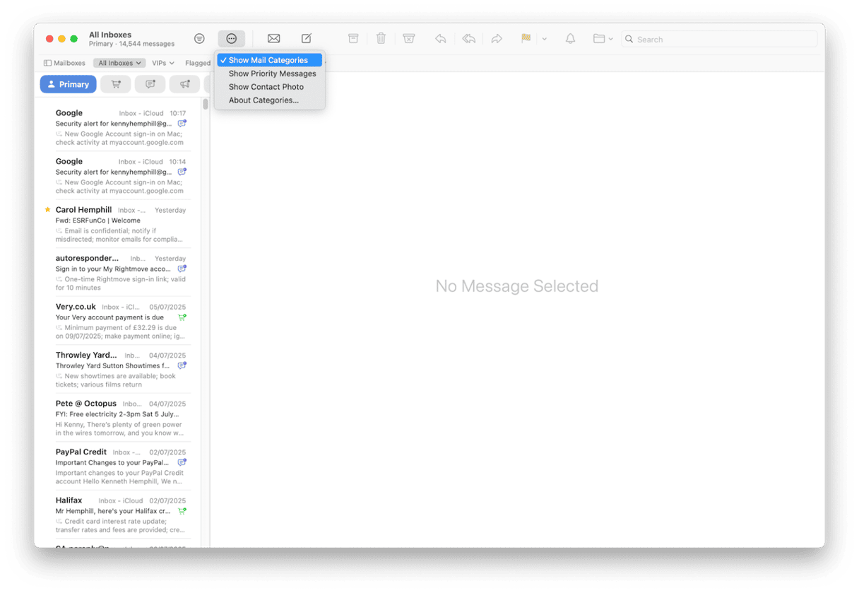 Apple Mail 的 macOS Sequoia 版本引入了一项新功能,可让您自动对邮件进行分类。它使用 Apple Intelligence 来确定电子邮件的内容并相应地对其进行分类。然后您可以选择要查看的类别。例如,“主要”是 Mail 认为最重要的消息,但如果您想查看在线购物收据,则可以点击手推车图标来查看与交易相关的电子邮件。要启用类别,请转到 Apple Mail 收件箱,单击顶部的三个点,然后选择“显示类别”。