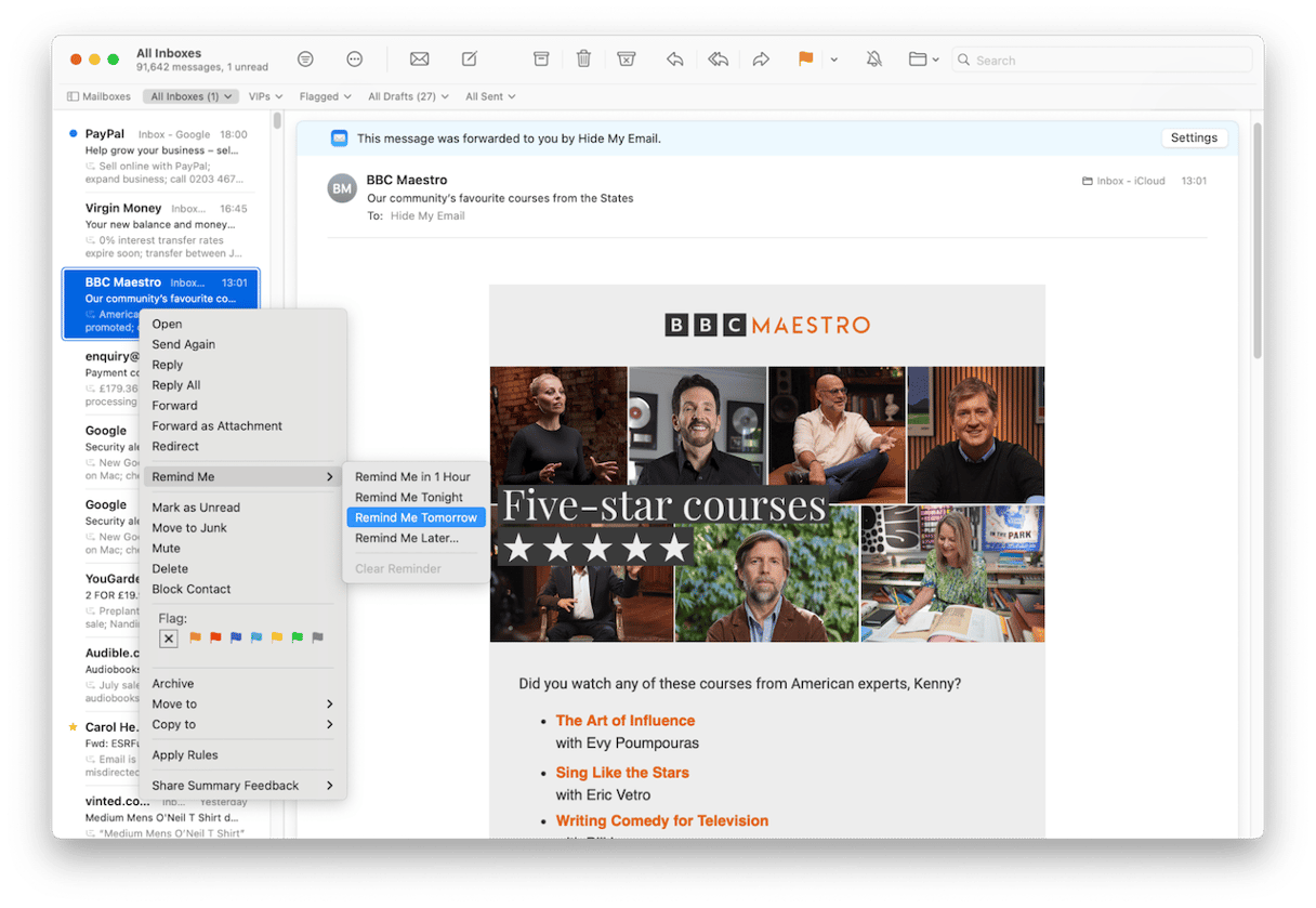 Apple Mail 有一项功能,可以让您在稍后能够回复重要电子邮件时收到提醒。其他电子邮件应用程序也有类似的功能,有时称为“暂停”。要在 Apple Mail 中使用“提醒我”,请用两根手指在收件箱中的邮件上向右滑动,然后选择“提醒我”,然后选择提醒时间段,或者右键单击该邮件,选择“提醒我”,然后选择时间段。当时间到来时,您将收到通知,并且该消息将显示在收件箱的顶部。通过使用“提醒我”并认真将邮件归档到文件夹或邮箱中,您可以保持收件箱整洁,同时确保您不会忘记回复重要邮件。