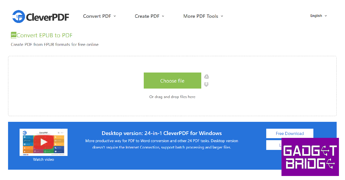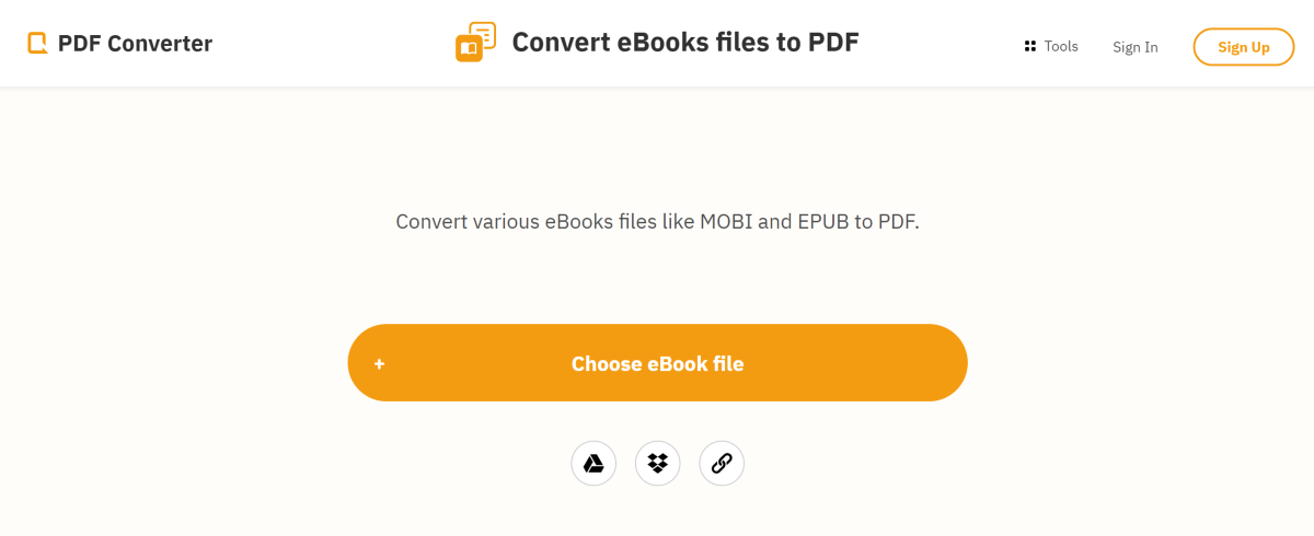 顾名思义,免费PDF转换是一款免费将 EPUB 和 MOBI 书籍转换为 PDF 的在线工具。使用该网站的优点之一是它还允许您从 Google Drive 和 Dropbox 上传文件。如果您的电脑上没有该文件,您可以删除其链接,该工具将自动为您转换它。该网站的界面干净、简约且易于理解。