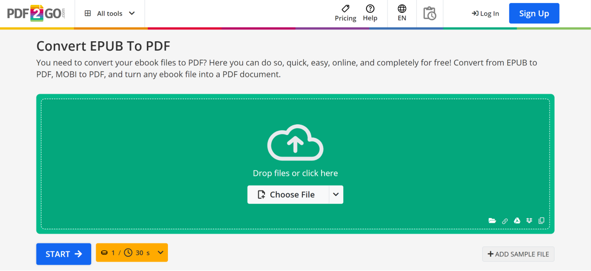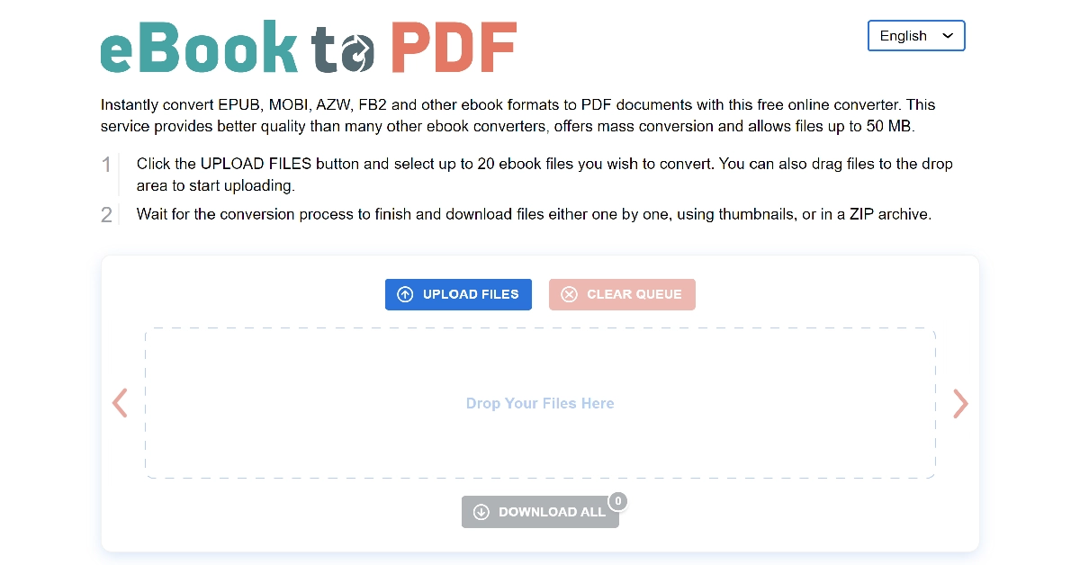 如果您有兴趣一次转换多个文件的格式,请查看电子书2pdf。这个免费的在线工具可让您一次转换最多 20 个标题。大小限制设置为 50MB。除了 EPUB 之外,您还可以转换 MOBI、AZW、FB2 等格式。虽然该网站使用云处理来转换您的文件,但它会每 60 分钟自动从服务器删除数据。