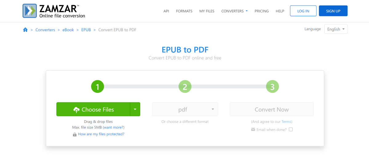扎姆扎尔是一款可靠的在线转换工具,可以免费将您的 EPUB 转换为 PDF。转换过程非常直观。您所需要做的就是将文件拖放到显示“选择文件”的绿色图标上。您也可以从计算机手动上传文件。 Zamzar 将读取文件并自动启动转换过程。完成后,您将能够下载转换后的文件并将其保存在您的设备上。如果您要转换大文件,您可以让 Zamzar 在完成后通过电子邮件通知您。