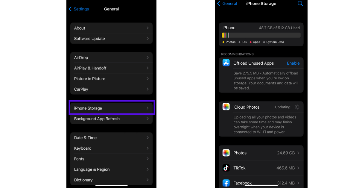 如果您的 iPhone 存储容量不足,它将无法安装新的应用程序更新。前往设置>常规>iPhone存储查看手机内部存储的剩余可用空间。如果设备已满,请删除一些较重的文件,为应用程序更新腾出空间。