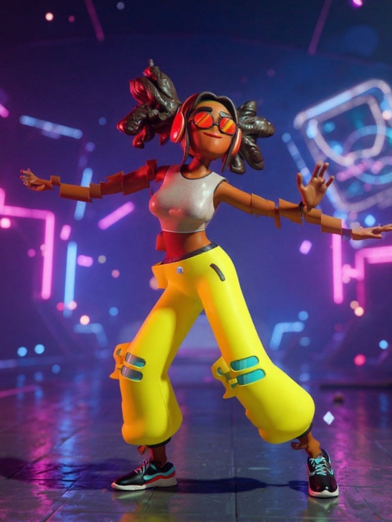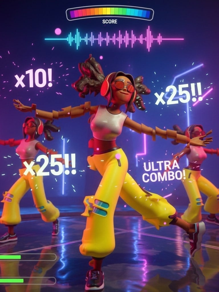 充满活力的节奏舞蹈游戏屏幕截图,具有参考照片中的三个相同的 3D 动画角色,保留了她独特的发型、耳机、太阳镜、运动黄色裤子和自信的舞蹈姿势。身临其境的电影灯光,霓虹粉色和紫色的光芒,光滑的反光舞池在聚光灯下闪闪发光,动态的 3D 卡通风格。具有沉浸式 UI 的节奏游戏界面:顶部的计分表、与节拍同步的彩色音乐波形动画、阶段计时器倒计时和浮动组合数字。高度细致的游戏氛围,包括能量条、霓虹灯粒子效果和身临其境的街机节奏游戏 HUD 元素。超详细、电影般、身临其境的 3D 动画。