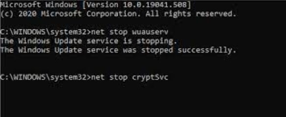 步骤2。暂停服务后,您需要使用以下命令重命名 Catroot2 目录和 Software Distribution。