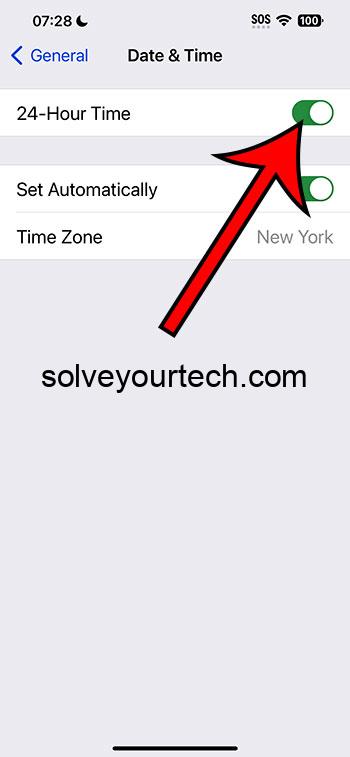 通过打开“24 小时时间”选项,您将指示您的 iPhone 放弃 AM/PM 系统,转而采用 24 小时格式。这一变化是立即发生的,并且适用于整个系统。