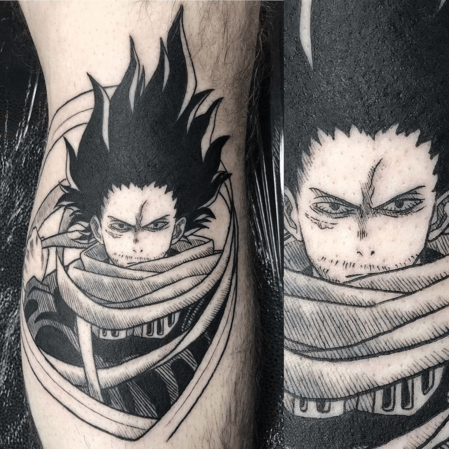 这个腿部纹身精美地再现了《我的英雄学院》的主角。在激烈的动作镜头中,德库似乎准备好在底特律进行终极粉碎。