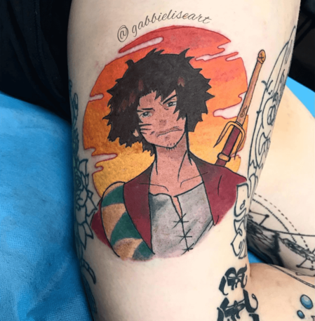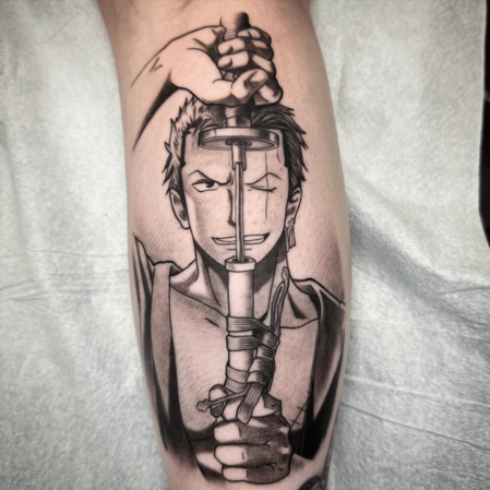 对于观看了 1000 多集的《海贼王》忠实粉丝来说,获得受动漫启发的纹身是一件轻而易举的事。这个纹身向战士罗罗诺亚·索罗致敬,其左眼上的标志性伤疤和三把剑的剑柄上有他标志性的伤疤。