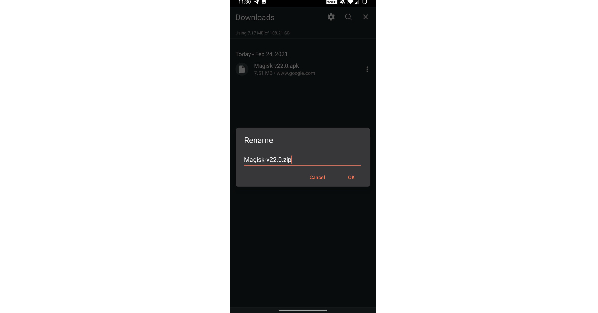 步骤3:打开设备上的“下载”文件夹并重命名 Magisk APK 文件。将 .apk 扩展名替换为 .zip。