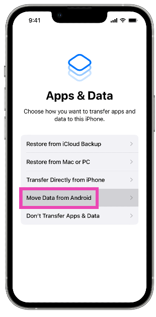 Apple 的 Android 版 Move to iOS 应用程序提供了一种将所有数据传输到新 iPhone 的本机方法。在 iPhone 上,首次设置设备时,您可以在快速启动屏幕上访问传输界面。此选项稍后将不可用。