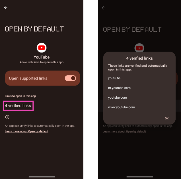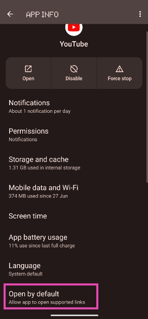 如果您无法在 WhatsApp 上打开 YouTube 链接,请尝试在网络浏览器中加载它们。前往设置>应用程序>YouTube>设为默认值并将切换栏关闭“打开支持的链接”。