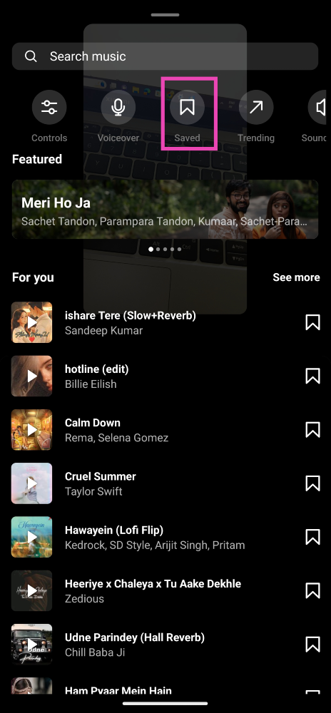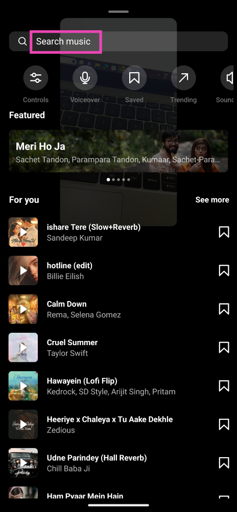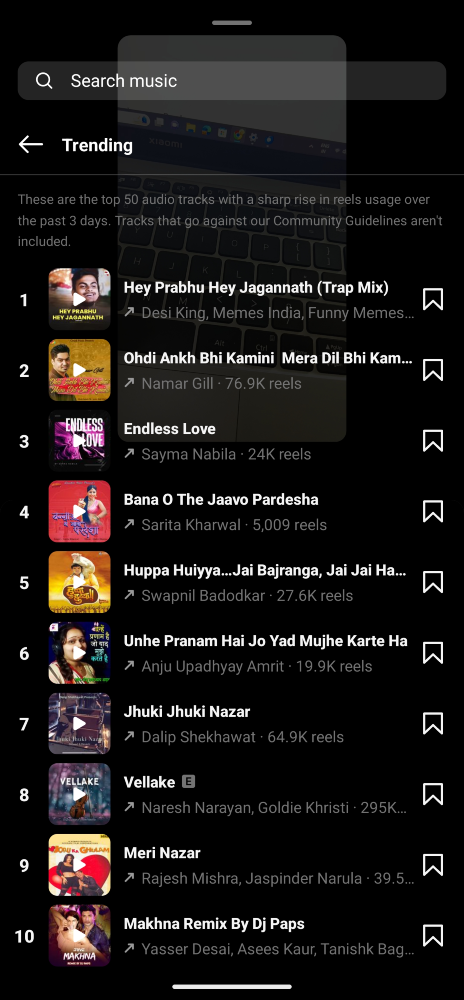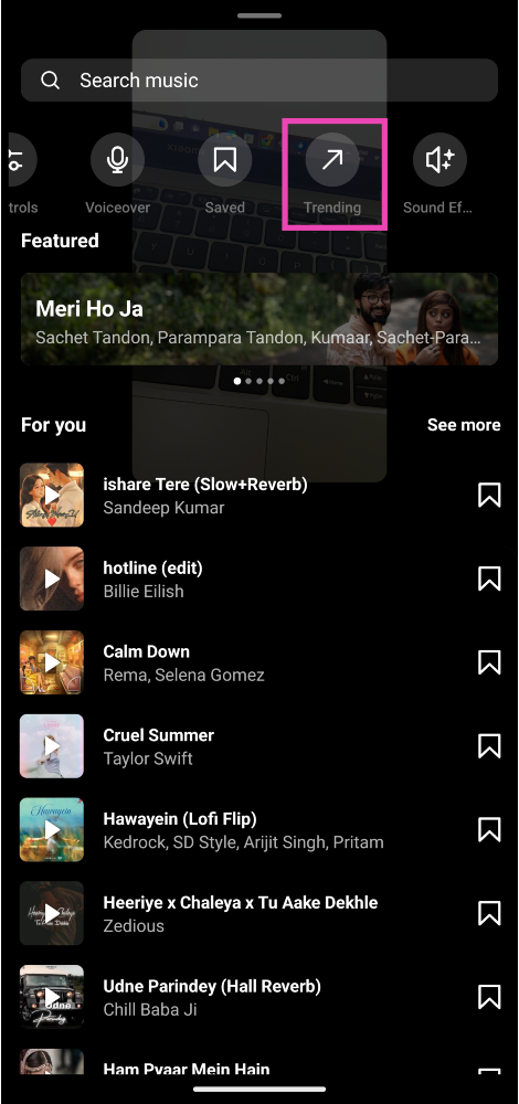 拍摄 Reel 后,点击编辑页面上的音符图标,点击趋势,然后选择一首歌曲。在下一页上,使用滑块选择您想要作为卷轴背景音乐的歌曲部分。打完毕一旦您对结果感到满意。