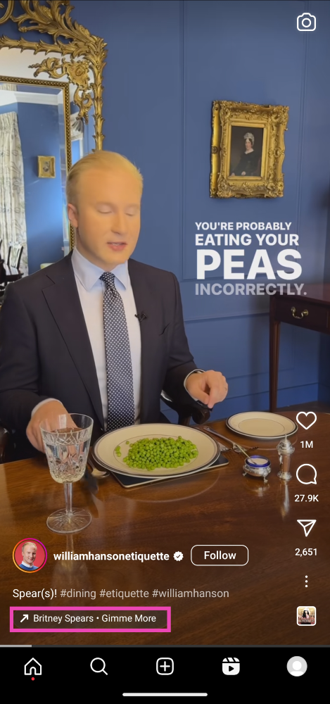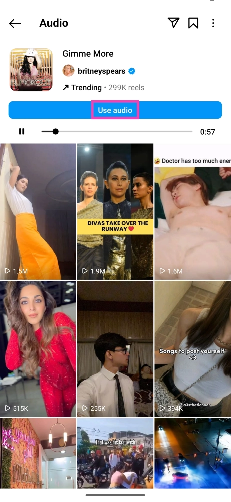打开 Instagram 上的 Reel,然后点击页面底部的歌曲或音频标题。选择 '使用音频'并开始拍摄您的 Reel。
