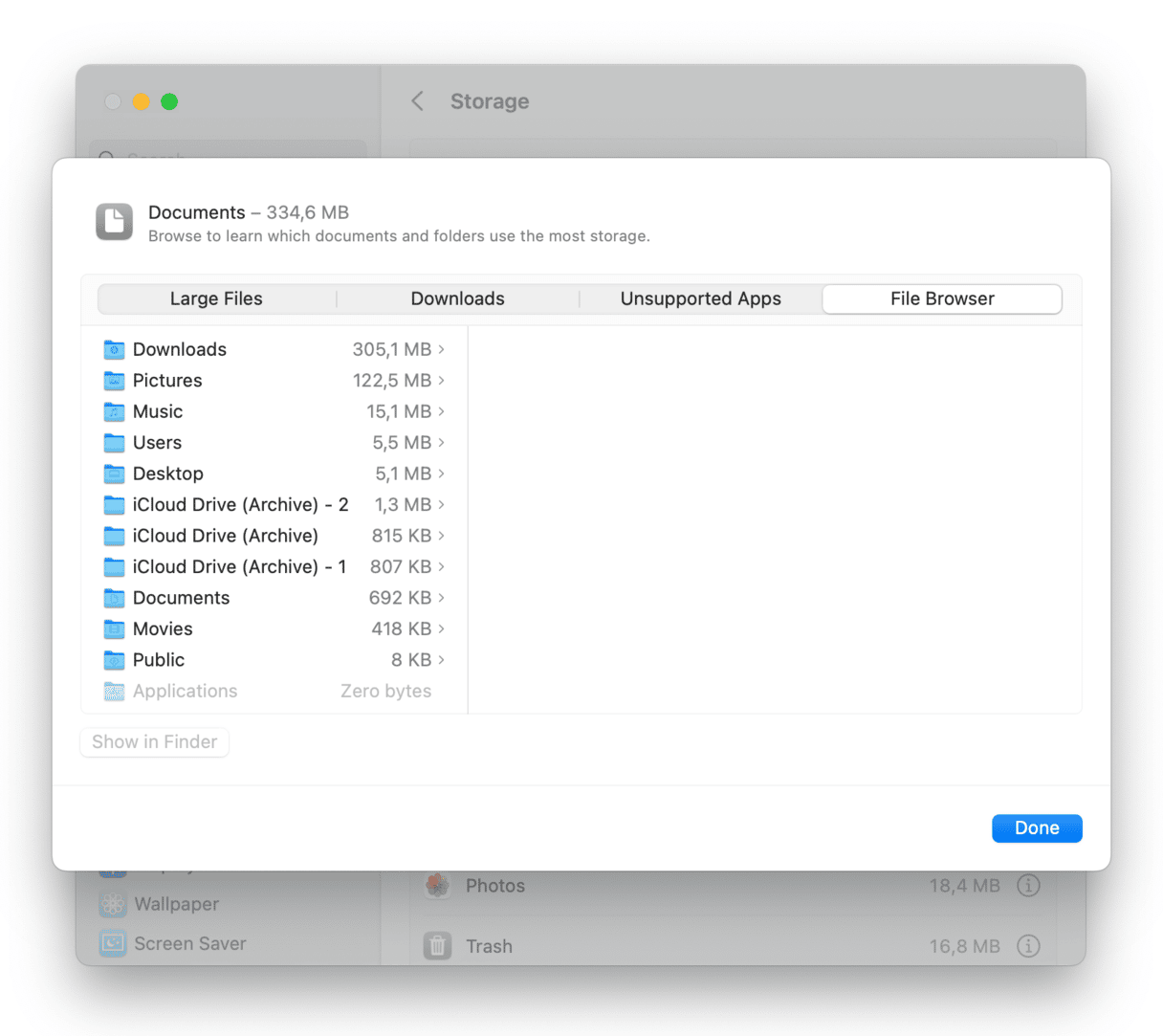 浏览每个子文件夹,然后按 Command-I 获取信息并检查每个子文件夹中有多少数据。您很快就会发现您宝贵的存储空间去了哪里。