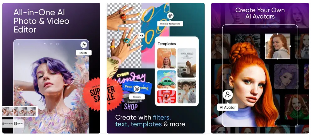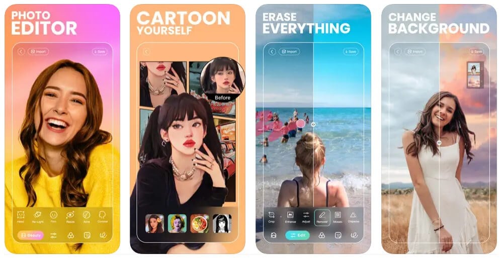 - 强大的AI工具:AI美肤、AI照片增强器、AI照片橡皮擦、AI背景去除、AI头像制作