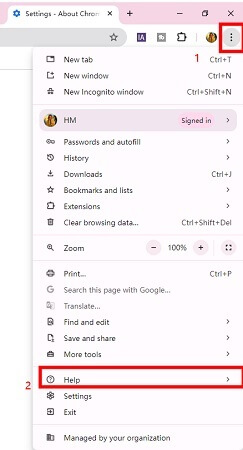 步骤1启动 Google Chrome 并单击右上角的三个点,选择“帮助”,