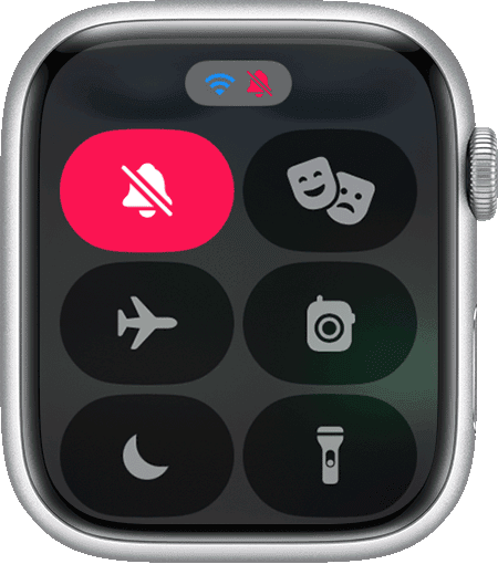 另一种方法是使用控制中心。按数字表冠下方的侧面按钮即可显示表盘。从底部向上滑动可打开控制中心。在这里您应该看到一个响铃图标。点击此图标可打开静音模式。当出现带有斜线的铃铛图标时,您就会知道它处于活动状态。