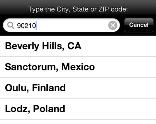 步骤 4:在屏幕顶部的搜索字段中输入城市、州或邮政编码,然后选择与您想要查看天气信息的位置相对应的结果。
