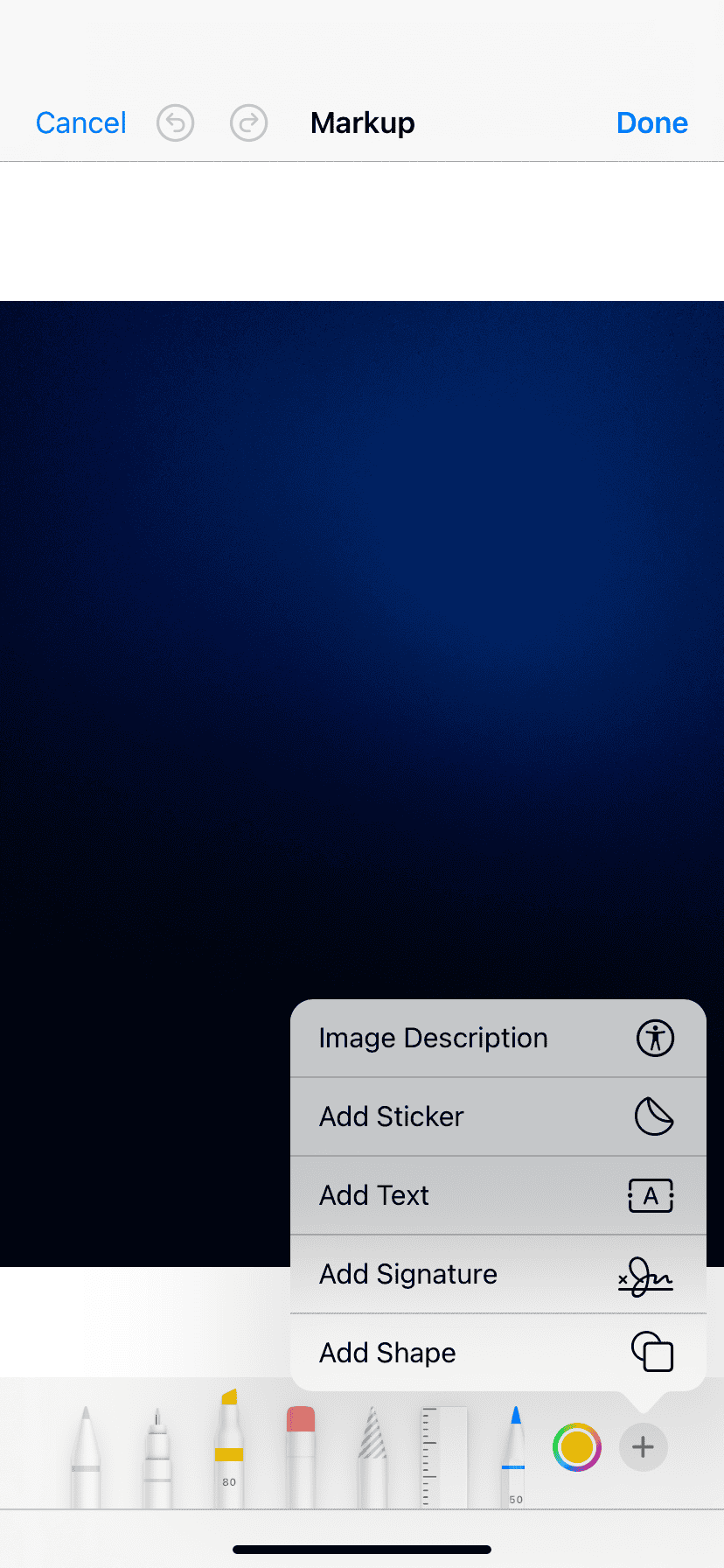 iPhone 上的照片应用程序包含一个标记工具,用于向图像添加贴纸。要使用它,请打开“照片”应用程序并选择一张图片。点击“编辑”按钮,然后点击“标记”图标(圆圈中的笔)。查找加号图标以访问贴纸选项。