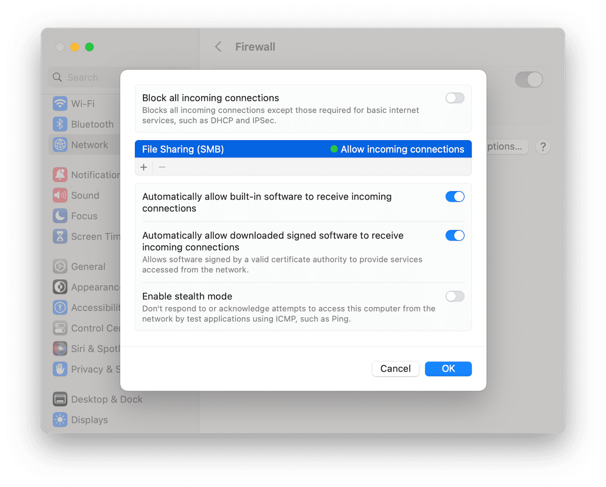 Mac 的内置防火墙可防止未经授权的应用程序和服务接受传入连接。但是,如果您将其设置为阻止所有传入连接,则可能会阻止 AirDrop 正常工作。