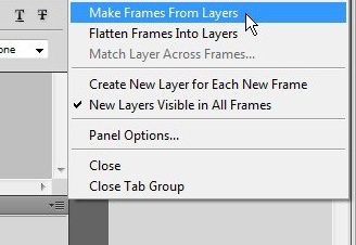 单击右上角的按钮动画片窗口(该按钮看起来像 4 条水平线旁边的向下箭头),然后单击从图层制作框架选项。