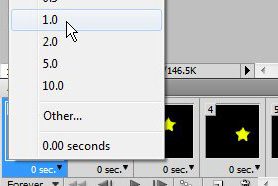 单击右侧的向下箭头0秒在你的其中一个框架下动画片窗口,然后选择您希望该帧在动画 GIF 中显示的时间。对图像的每一帧重复此步骤。我喜欢选择1.0Photoshop CS5 中许多动画 GIF 的帧持续时间,但尝试不同的持续时间,直到找到最适合您的持续时间。