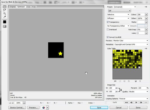 现在您已经在 Photoshop CS5 中创建了动画 GIF,因此您必须保存它。点击文件窗口顶部,然后单击为网络和设备保存。单击窗口右上角的下拉菜单以选择动图选项,然后单击节省按钮位于窗口底部。