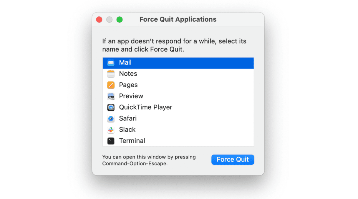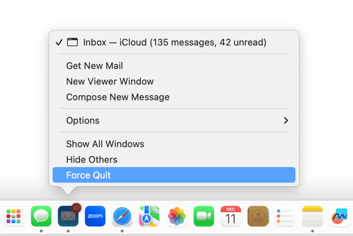 Apple Mail 无法正常工作的第一个解决方案是强制退出该应用程序。有几种方法可以做到这一点: