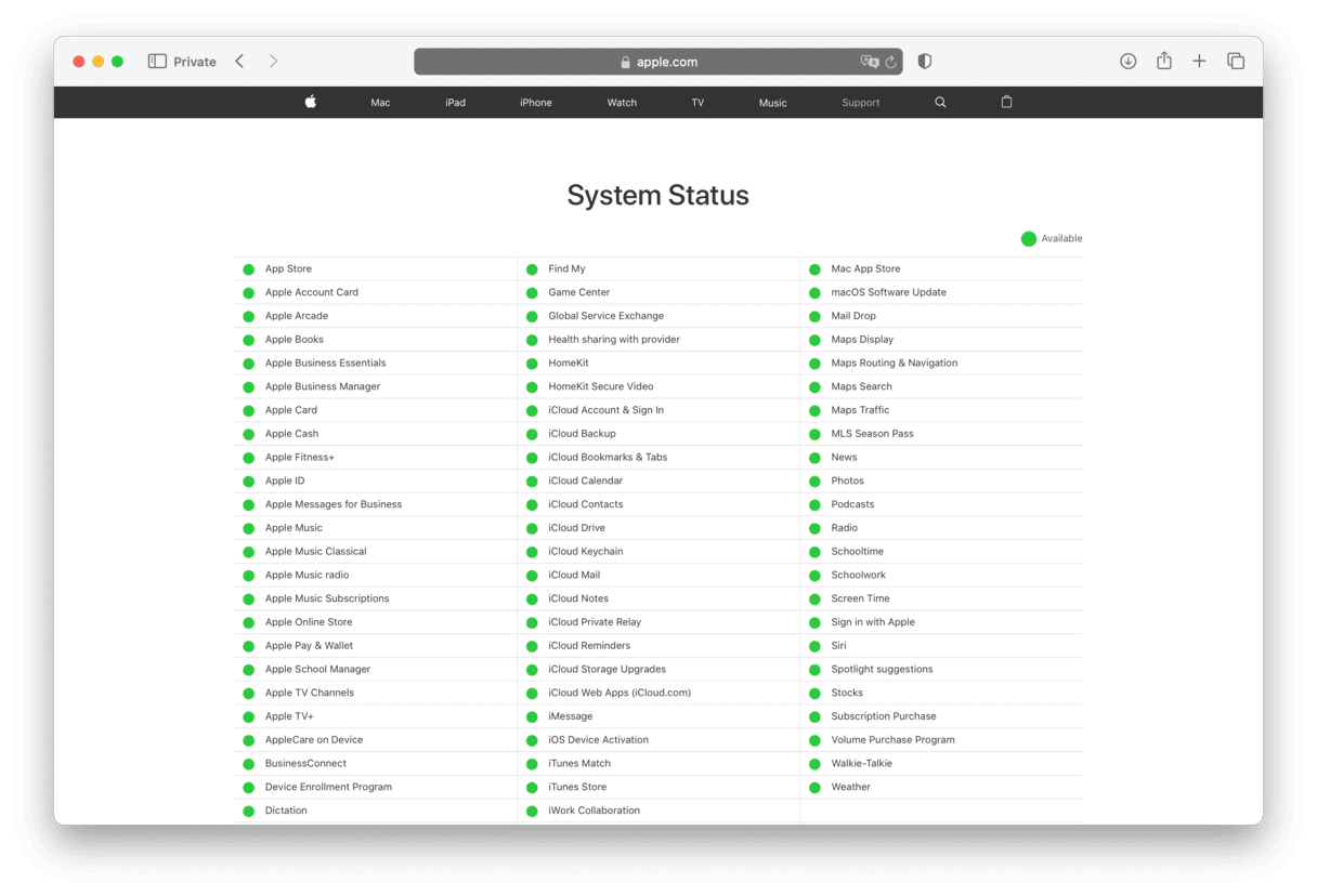 问题可能不在于邮件应用程序本身,而在于苹果的服务器。但请注意,该提示仅适用于 iCloud 邮件。要检查是否属于这种情况,请访问苹果系统状态页面并检查 iCloud 邮件。如果它是绿色的,则当时没有遇到任何问题。如果出现问题,您唯一的选择就是等待 Apple 修复。