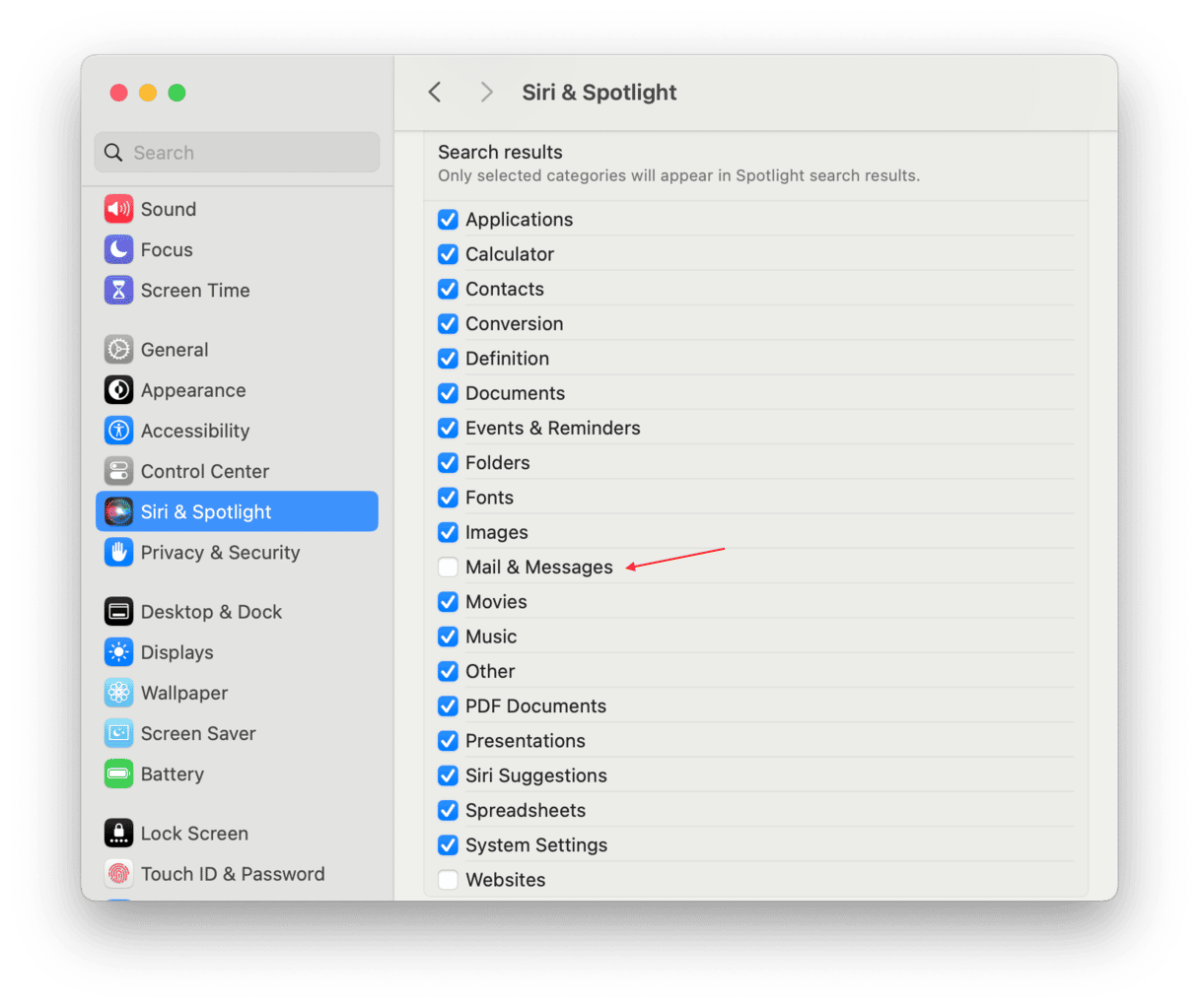 - 在“搜索结果”下,确保选中“邮件和消息”选项。