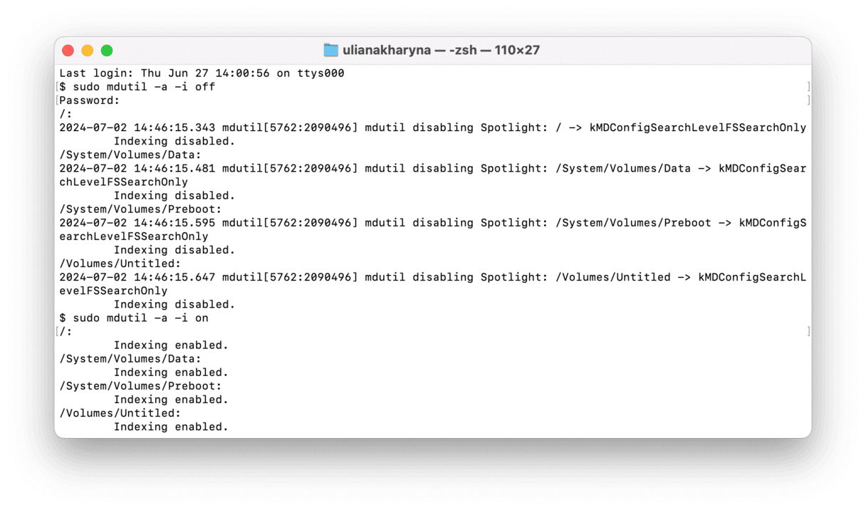 sudo mdutil -a -i off - 输入您的管理员密码并按回车键。