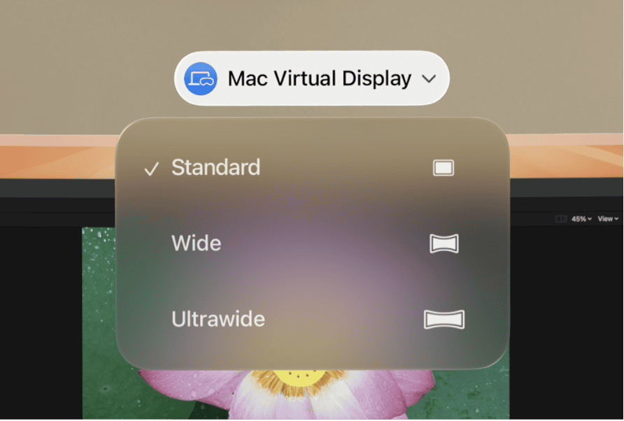 随着 VisionOS 2.2 的发布,Apple 为 Mac Virtual Display 引入了扩展的显示选项。以前,虚拟显示器提供标准的宽高比。现在,用户可以在“宽”和“超宽”模式之间进行选择。超宽模式尤其令人印象深刻,它提供的工作空间相当于并排的两个 5K 显示器。所有模式现在也都有弯曲的呈现。