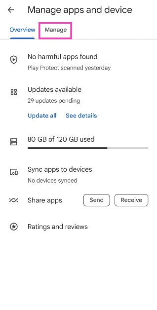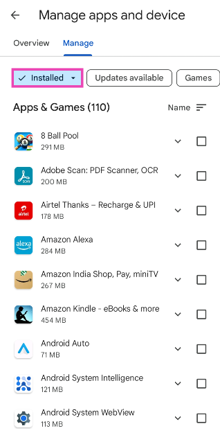 您可以通过以下方式轻松找到并恢复 Android 手机上最近卸载的应用程序Google Play 商店>配置文件>管理应用程序和设备>管理>未安装。