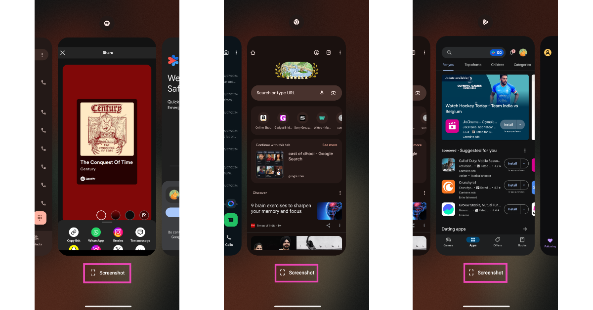 Android 智能手机允许您在不打开应用程序的情况下截取应用程序的屏幕截图。您可以从应用程序预览屏幕本身执行此任务。使用手势控制或专用导航图标转到应用程序轮播/预览屏幕。点击应用程序卡片下方的“屏幕截图”选项即可截取当前页面的屏幕截图。
