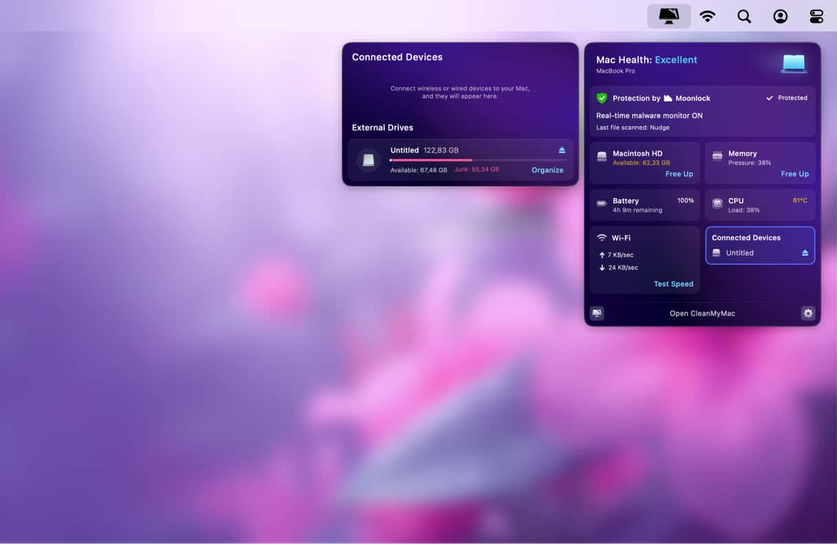 安装应用程序后,您可以在菜单栏中单击一个iMac图标,并将显示连接到Mac的设备,包括外部驱动器和USB棒。如果单击一个,它将显示其容量和可用空间。单击组织,它将使用CleanMymac的工具来分析驱动器上的文件,并将结果作为不同的混乱组提出。从那里,您可以选择和删除类似的图像,重复的文件,大和旧文件以及其他不必要的内容。您可以在此处免费下载CleanMymac。