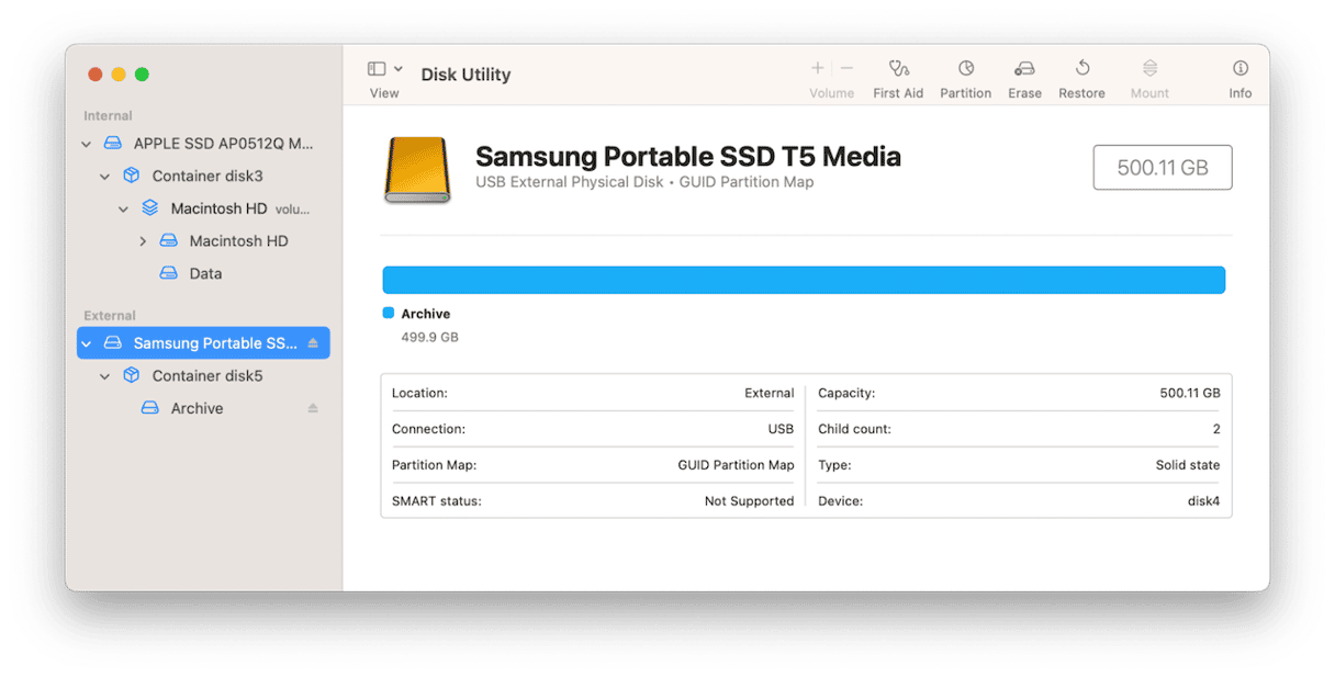 - 如果尚未安装驱动器,请在侧边栏中选择驱动器,然后单击磁盘实用程序工具栏中的安装。
