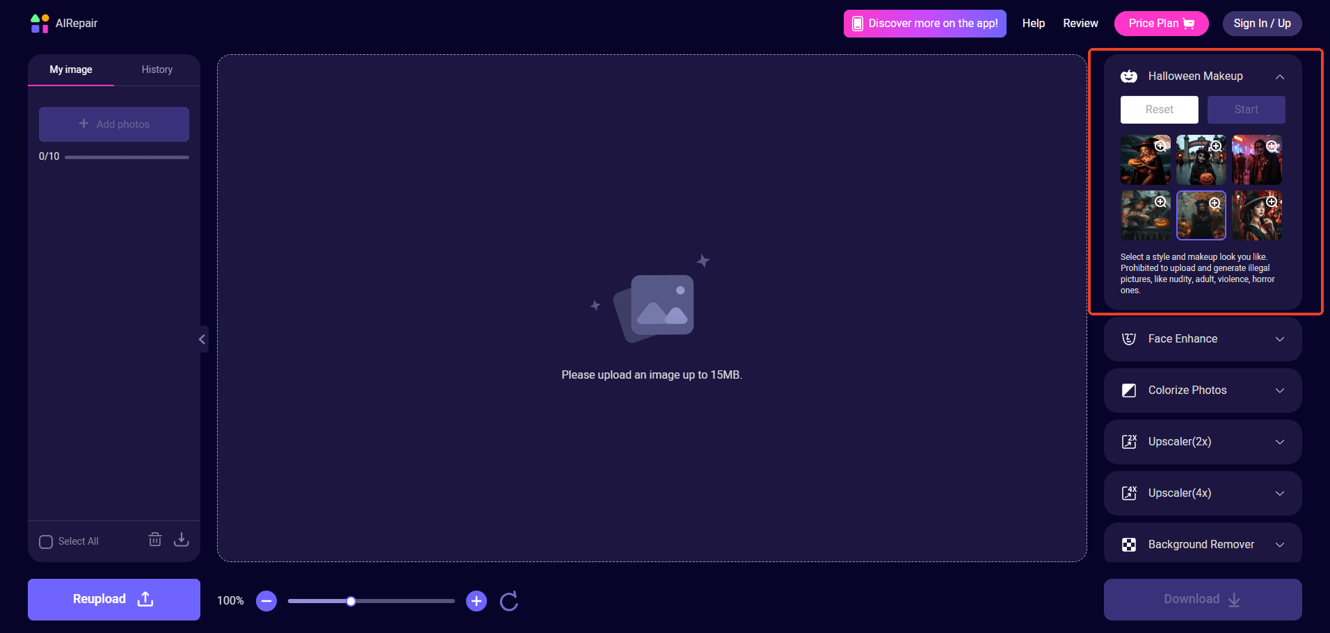 AIRepair 是一款人工智能驱动的照片增强工具,可以应用万圣节妆容在几秒钟内过滤照片。借助内置的人工智能技术,创造万圣节造型比以往更容易。无需花费太多时间上传照片或选择您喜欢的万圣节妆容,您可以将万圣节造型保存到您的设备上。