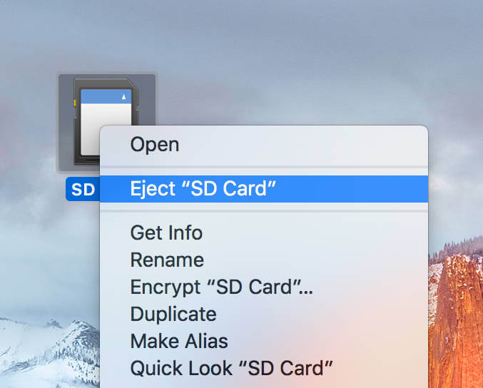 步骤3:单击 SD 卡图标一次将其选中。从菜单栏中选择“文件”,然后选择“弹出”或按键盘上的“Command + E”。