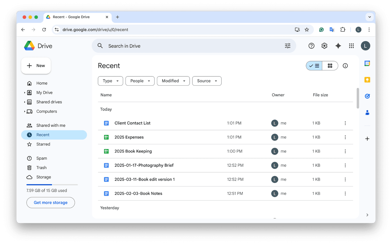 为了进行清理,我喜欢按“上次修改时间”对“我的驱动器”进行排序,这有助于显示我不再需要的旧文件。排序后,批量选择和删除可以快速恢复空间并减少混乱。如果你想知道如何按大小 f 对 Google 云端硬盘进行排序或文件清理,方法如下:
