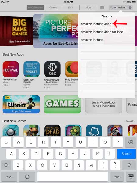 步骤 3:在搜索字段中输入“amazon instant”,然后选择“amazon instant video”搜索结果。