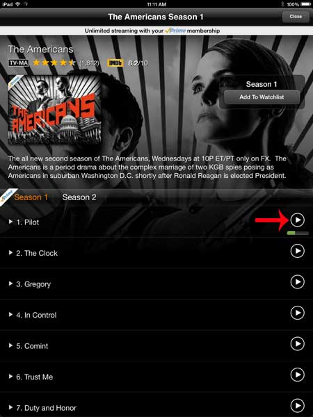 第 7 步:浏览到您想要观看的 Amazon Prime 视频(Prime 视频的左上角有一个横幅,上面写着 Prime),然后触摸“播放”按钮开始观看。
