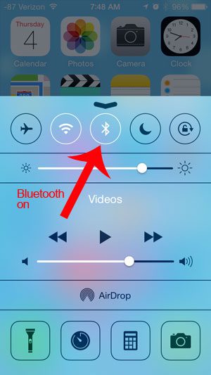 此外,您可以从主屏幕底部向上滑动以调出控制中心。此屏幕提供对一些常用功能的快速访问。下图中,蓝牙已打开。
