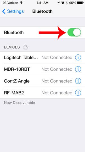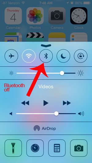 然后您可以触摸右侧的按钮蓝牙打开它并准备您的 iPhone 以开始与蓝牙设备同步。下图中蓝牙已打开。