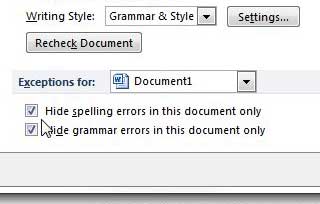 如果您只想禁用当前文档的拼写或语法检查,您可以选择选中左侧的框仅隐藏本文档中的拼写错误和仅隐藏本文档中的语法错误反而。这些选项与上述步骤 5 中的选项位于同一菜单中。