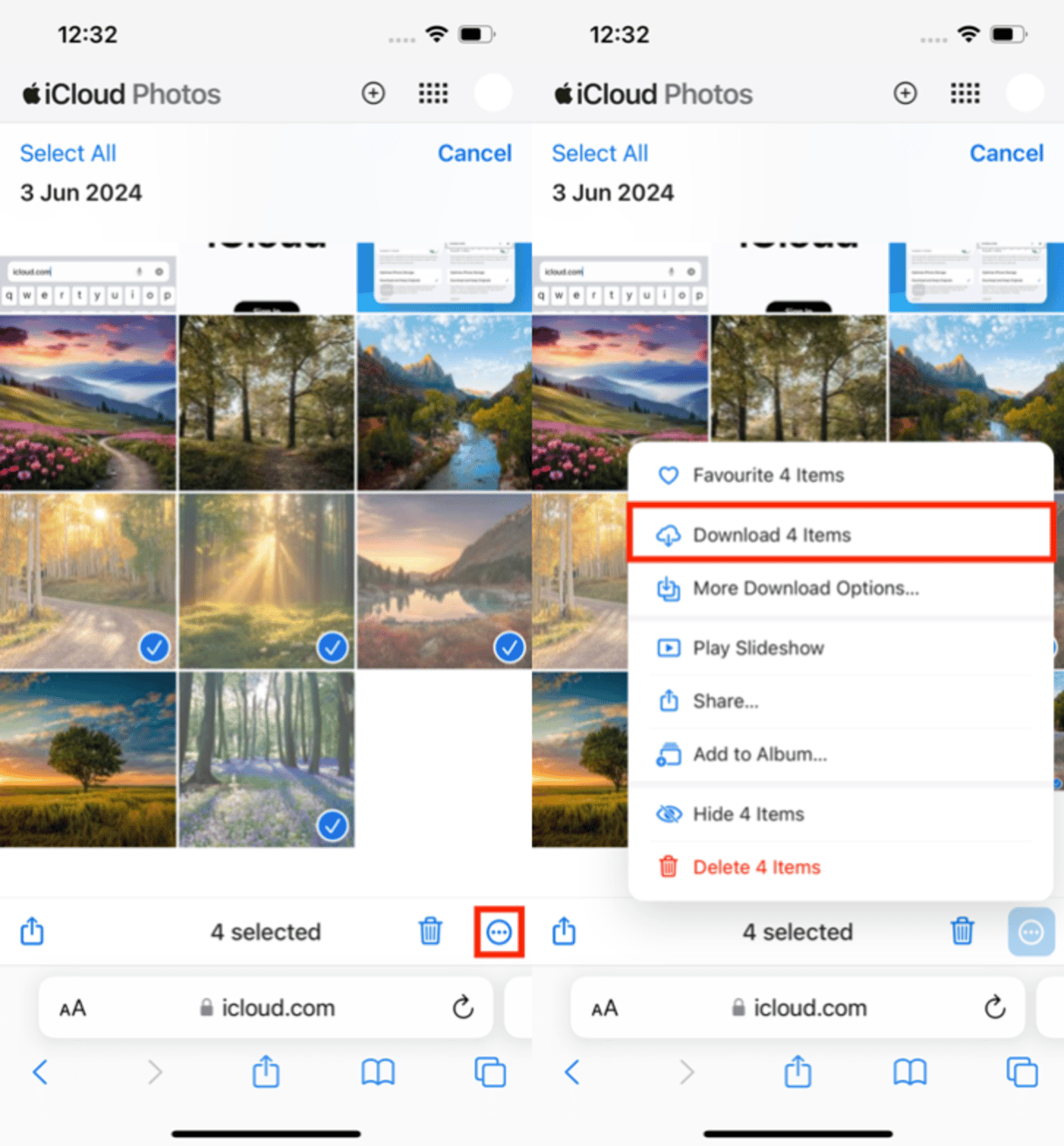 从 iCloud 下载照片之前,请确保您使用的 iPhone 已启用并登录正确的 iCloud 帐户。按照前面的说明通过 iPhone 浏览器访问 iCloud 照片。然后执行以下操作: