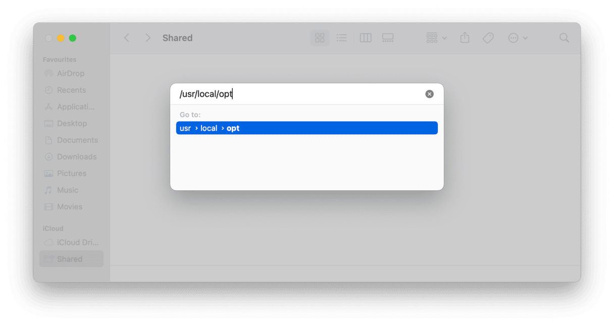 /usr/local/opt - 现在,您应该具有临时访问权限,因此如果您想再次访问它,您应该能够将其拖到 Finder 收藏夹中。