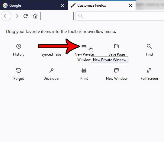 步骤 3:单击并按住新的私人窗口按钮,然后将其拖到工具栏中的空白区域。