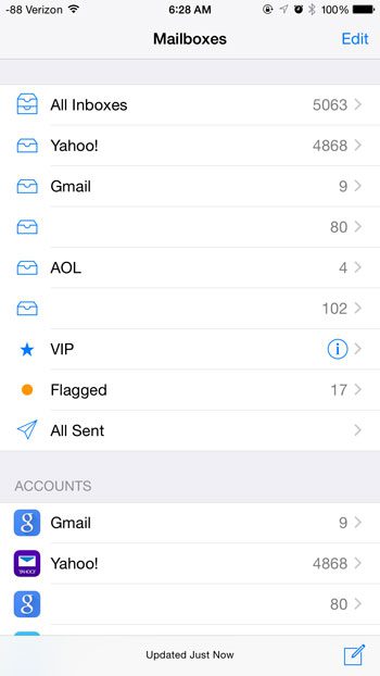 你现在应该有一个已全部发送文件夹上的邮箱菜单,如下图所示。如果打开该文件夹,您将看到从设备上的 IMAP 电子邮件帐户发送的所有邮件,以及通过 POP3 邮件帐户从 iPhone 发送的所有邮件。